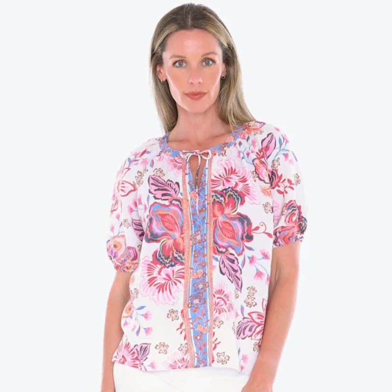 The Sweet Iris Top from Jump will add a vibrant pop of color to your wardrobe. It features a striking floral print bursting with shades of pink and blue on a crisp white background, on a soft cotton/viscose blend fabric. This short-sleeve top has a stylish split V-neckline with a charming tie neck, allowing you to adjust the look to your preference. The raglan sleeves create a relaxed and flattering fit, while the soft elastic cuffs gently gather the sleeves for a feminine, comfortable finish.